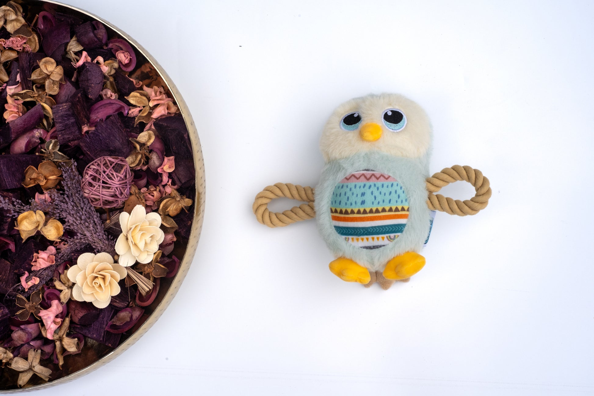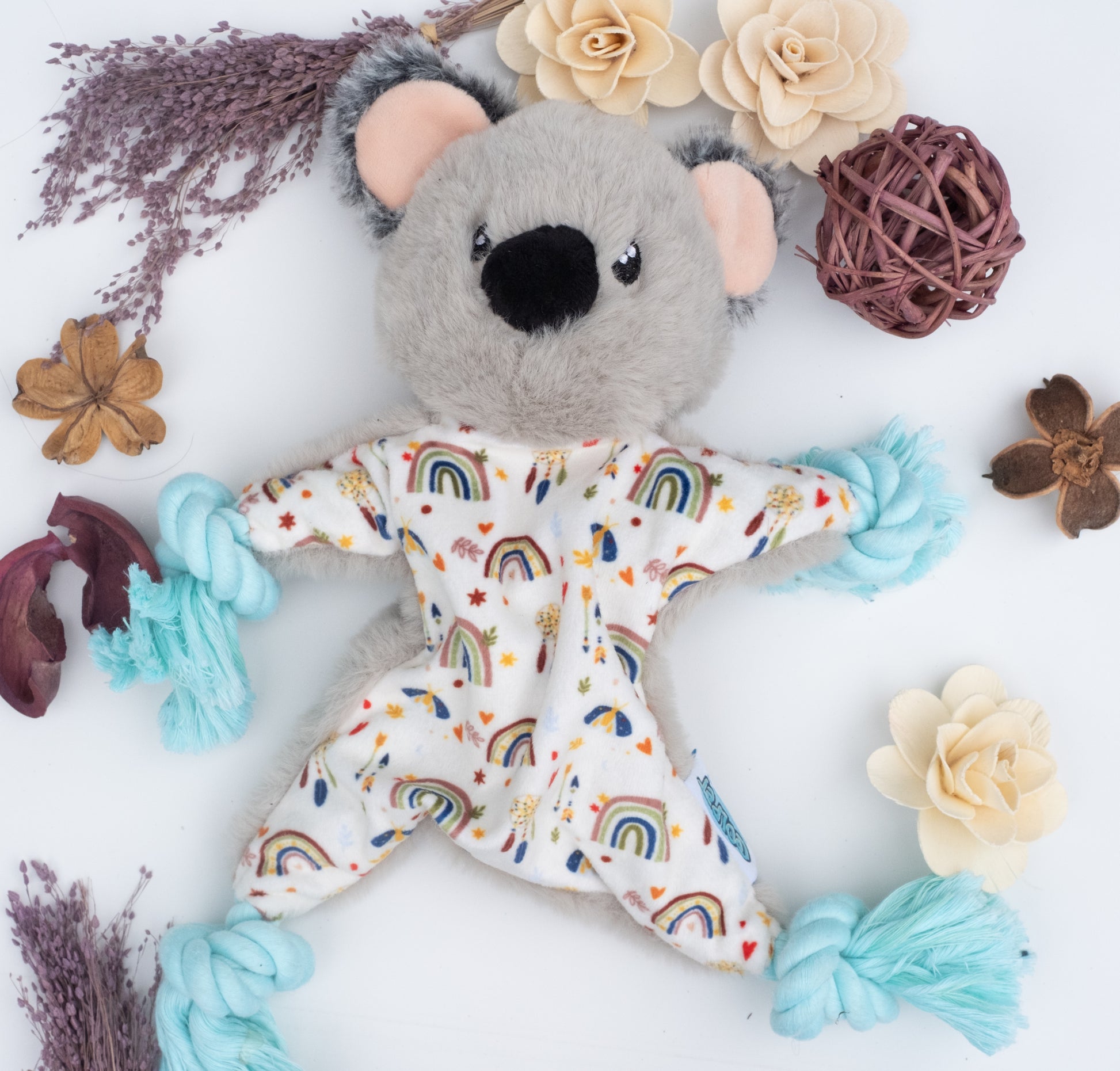 The softness of this toy needs to be touched to be believed. This cute little toy is wearing a rainbow baby grow with rope hands and feet. Don't forget the squeaker for the ultimate play time for your puppy. It’s body makes a crinkle sound, great for exposing pups to different sounds and stimulus in a positive way.